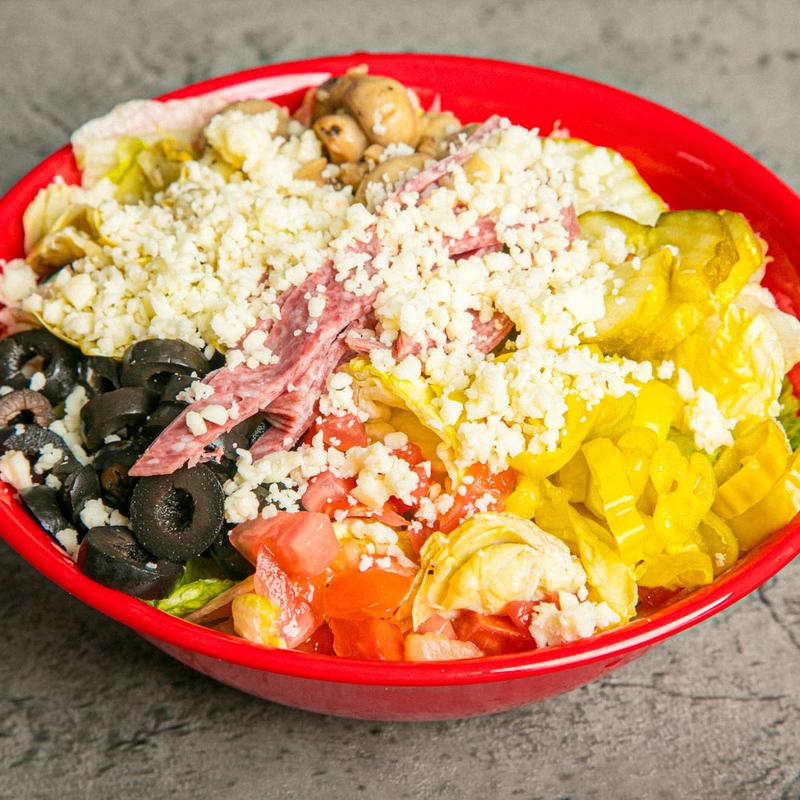 Marinated artichoke hearts, tomatoes, black olives, Feta cheese, onions, bell peppers and peperonicinis.